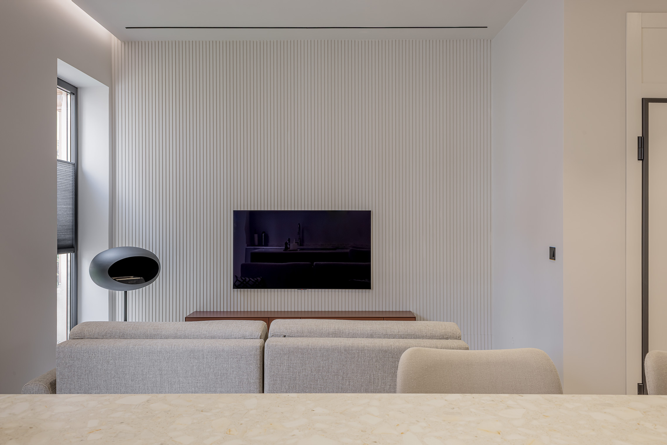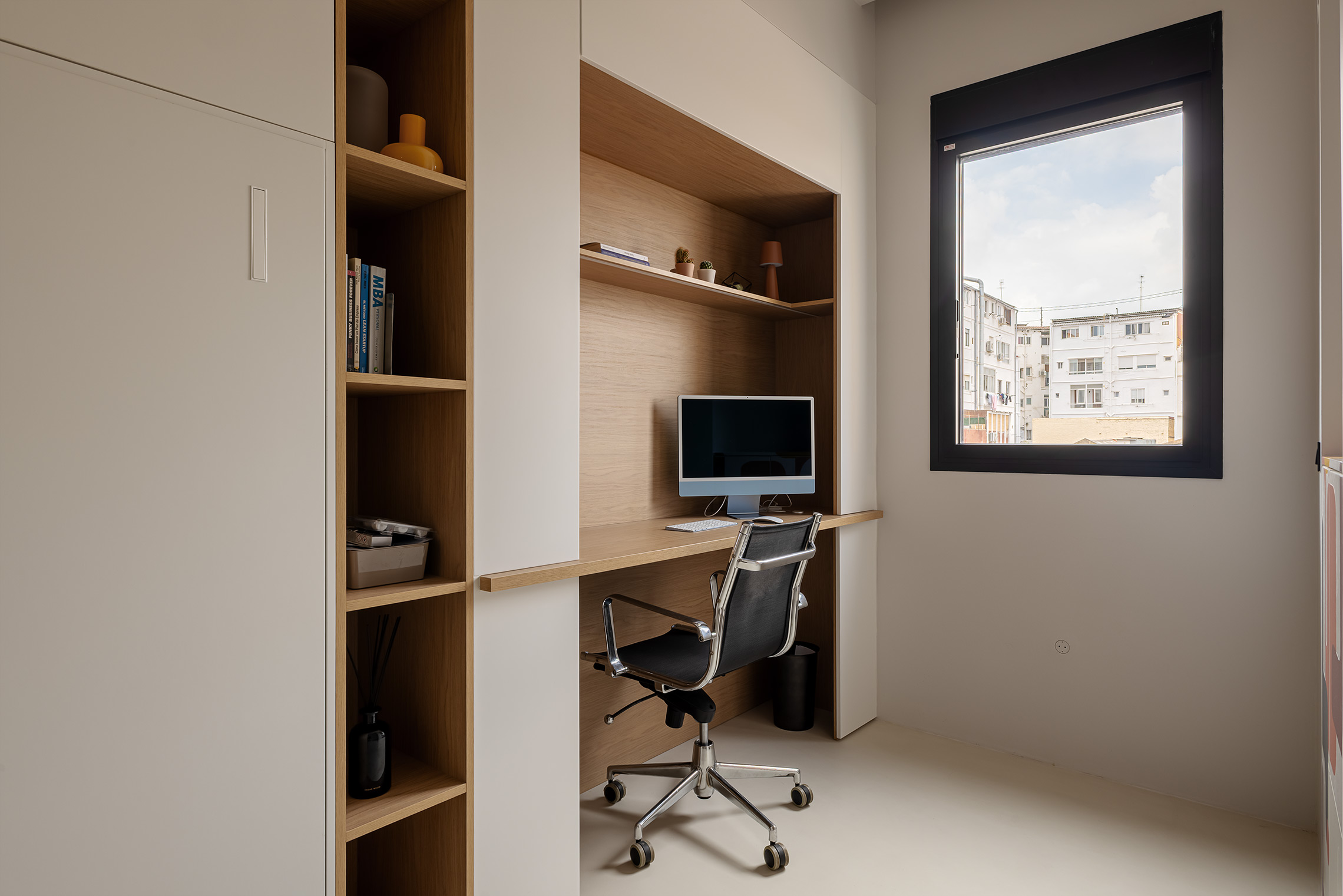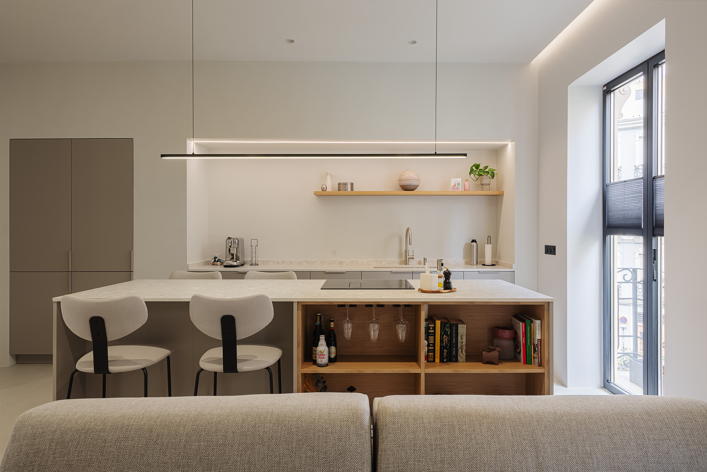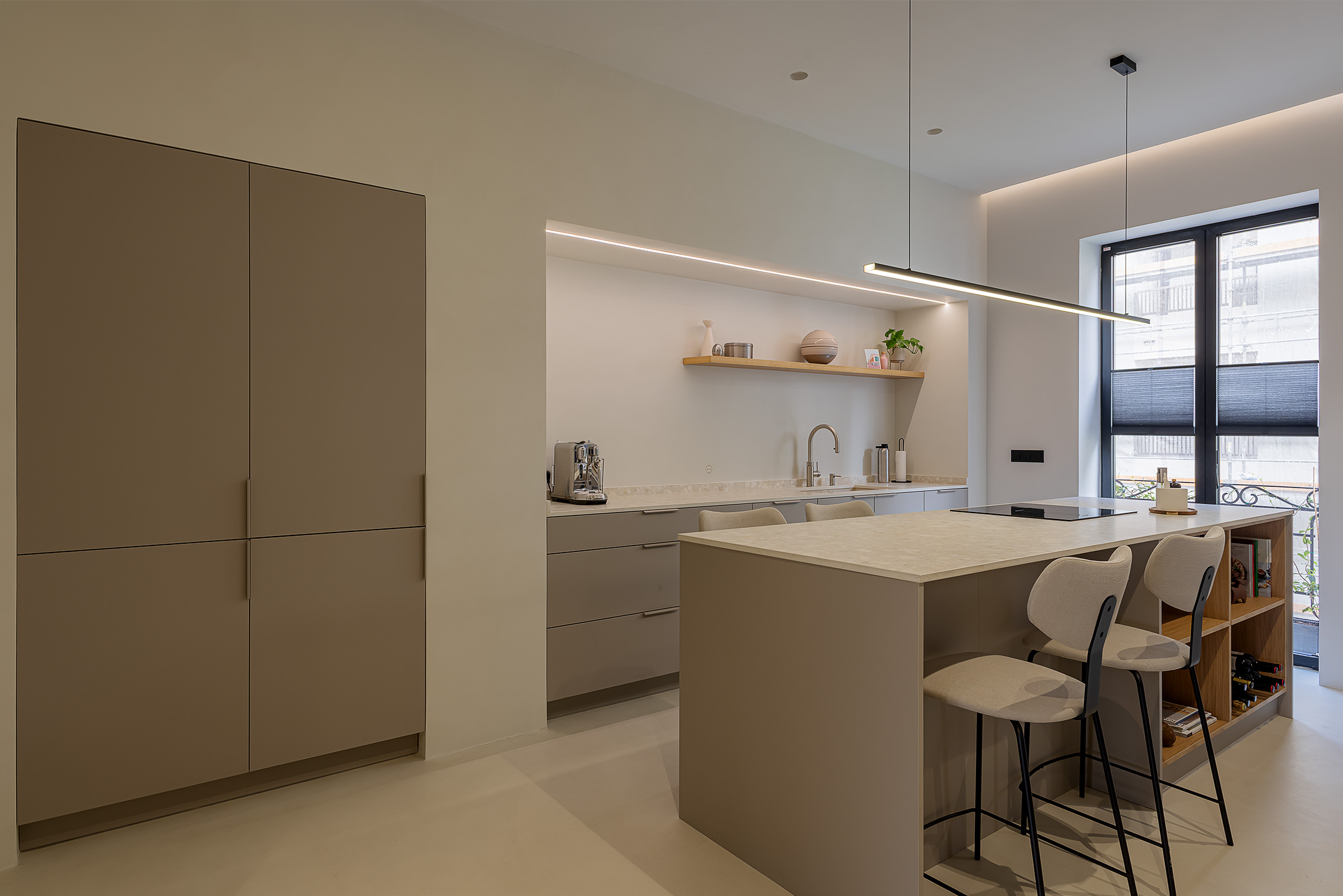 Comfort is gegarandeerd dankzij centrale airconditioning met wifi-bediening, ramen met verborgen kozijnen met thermische onderbreking en akoestische/thermische beglazing, en geluidsabsorberende wandpanelen in de woonkamer en slaapkamer. Daarnaast beschikt de woning over een op maat gemaakte wasruimte met ruimte voor zowel een wasmachine als een droger.
