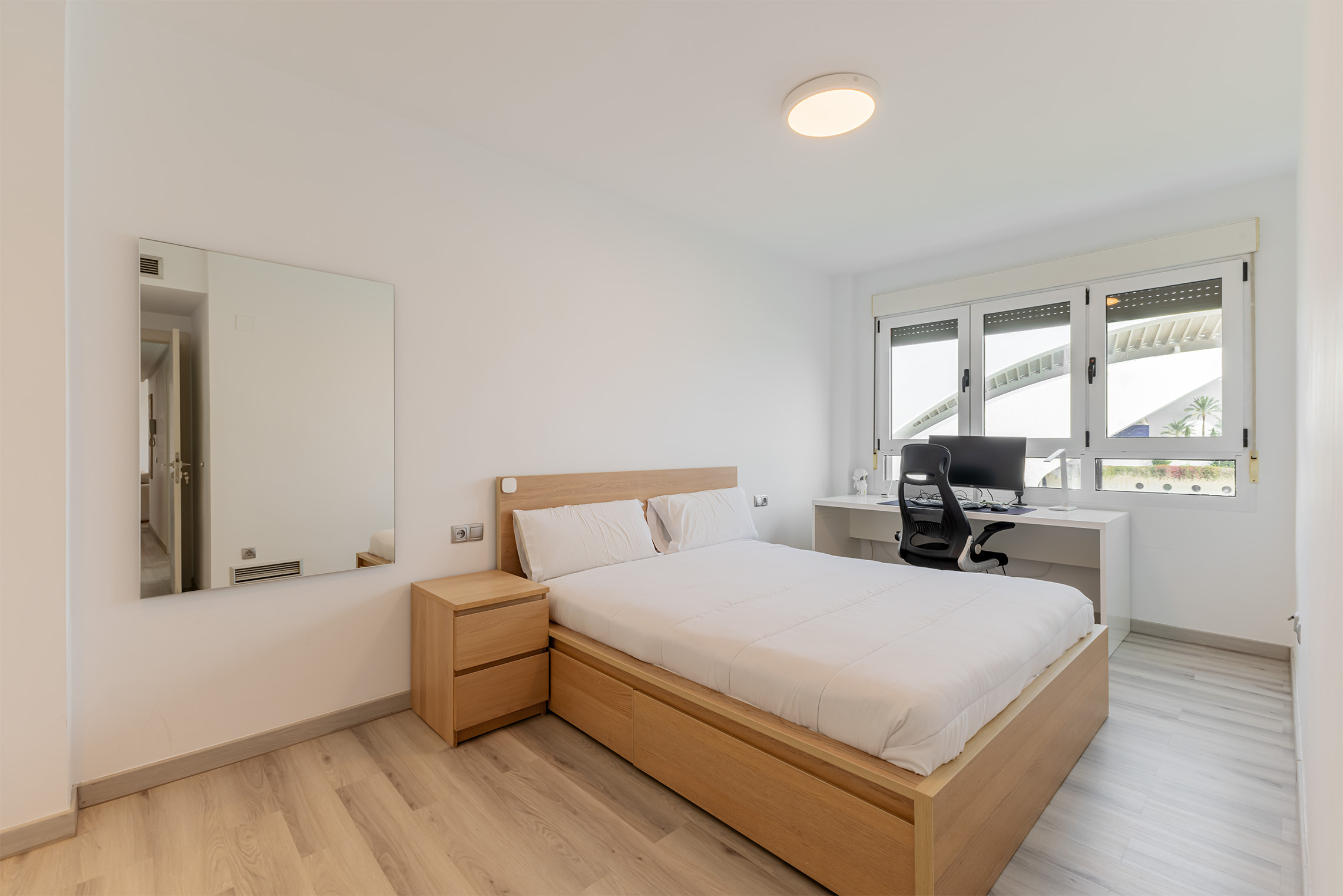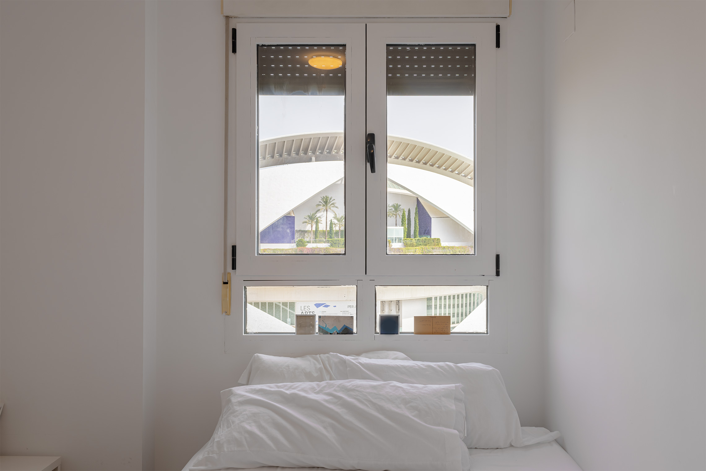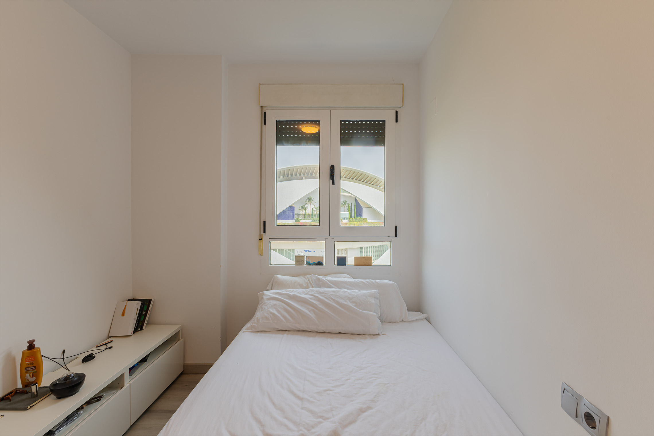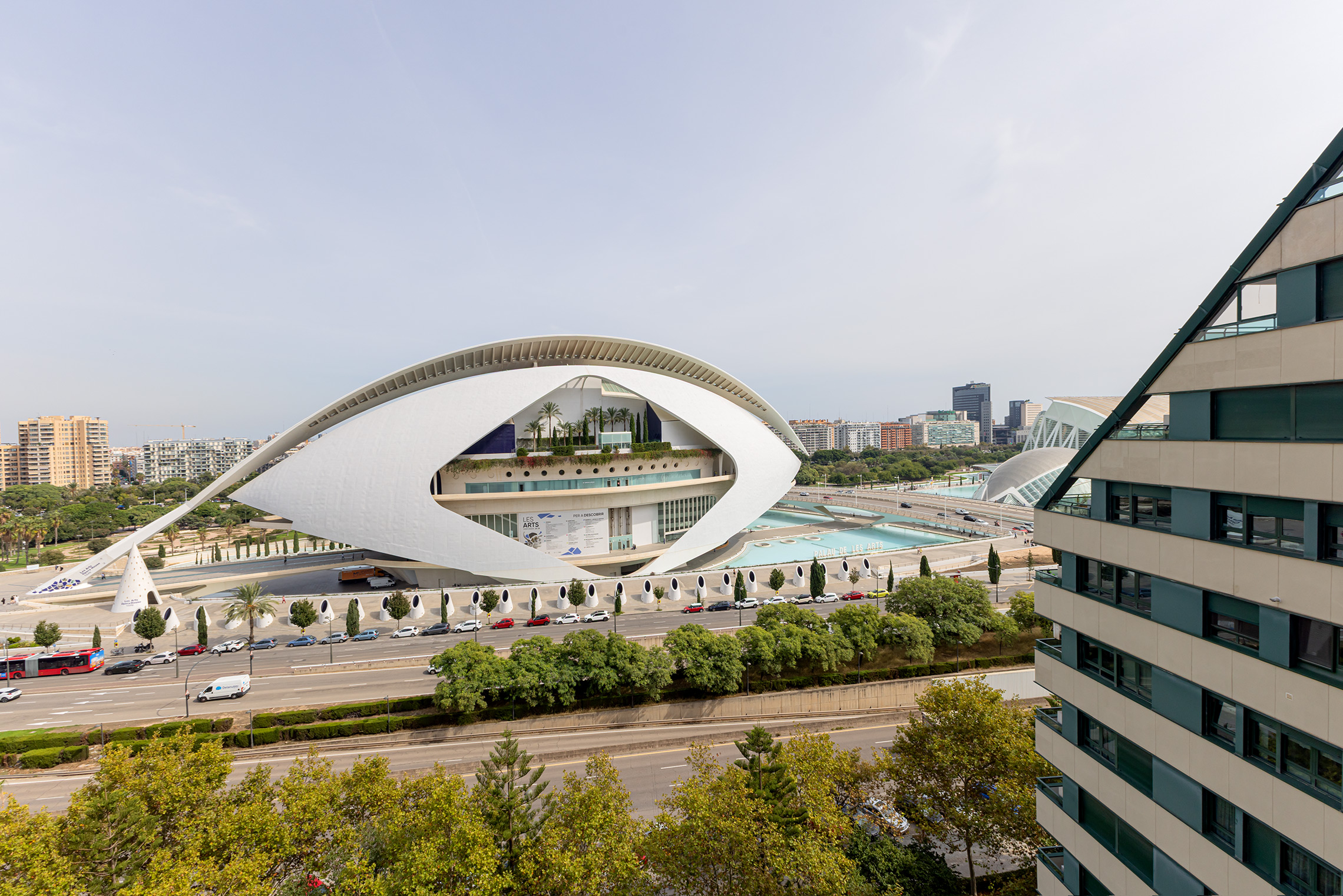 Dit lichte appartement ligt op de tiende verdieping van een gebouw uit 1999, in een van de modernste en meest gewilde wijken van Valencia, met uitzicht op de Turia-tuinen en direct uitzicht op de Stad van Kunst en Wetenschap. Het maakt deel uit van een complex dat eersteklas voorzieningen en een onovertroffen locatie biedt.