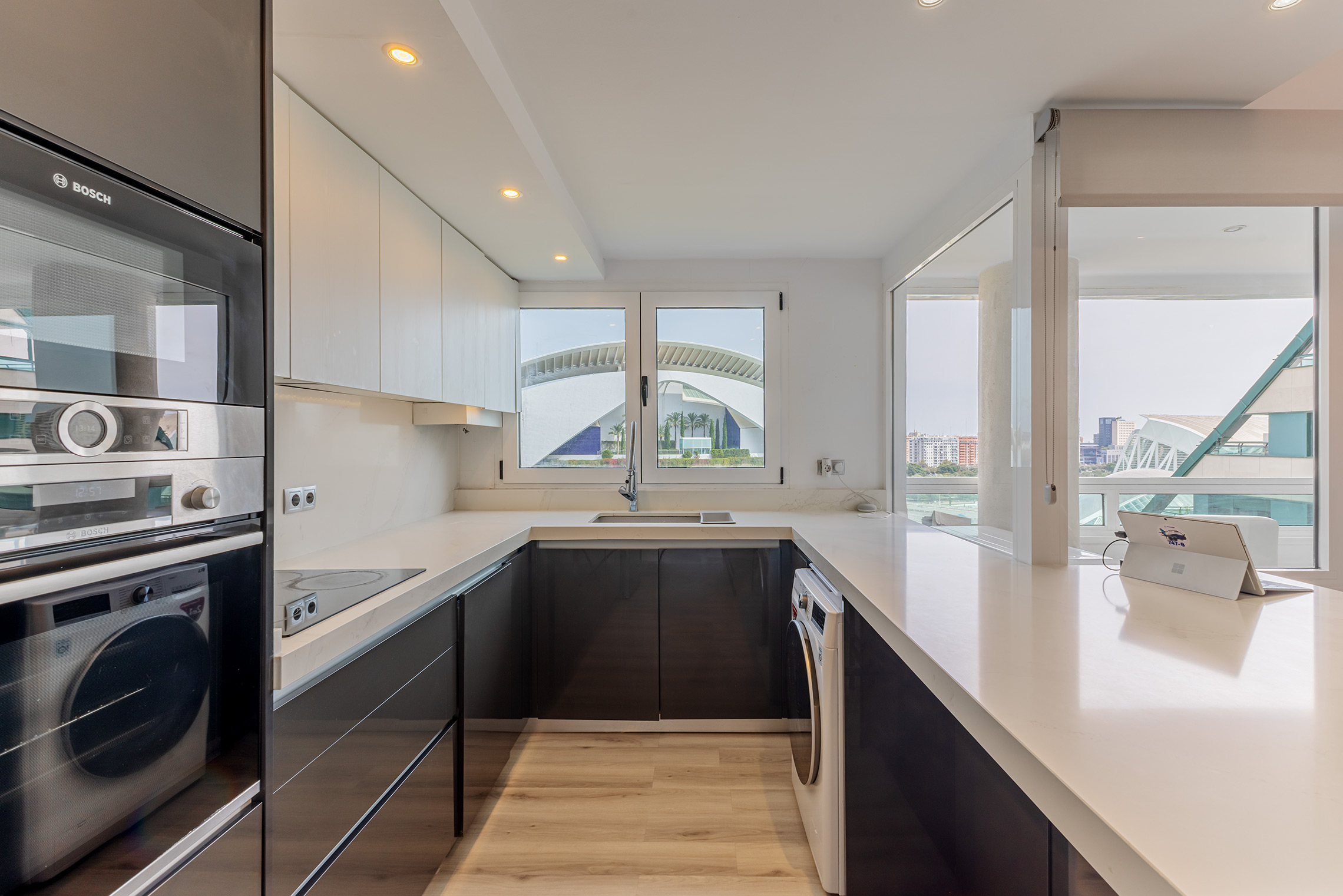Met een bebouwde oppervlakte van 108 m² (volgens het kadaster) heeft het appartement een functionele en comfortabele indeling. De ruime woon-eetkamer valt op door het natuurlijke licht en de verbinding met de geïntegreerde open keuken, waardoor een moderne en luchtige ruimte ontstaat die ideaal is voor het dagelijks leven. Het slaapgedeelte bestaat uit drie slaapkamers, waarvan één met een en-suite badkamer, en een tweede complete badkamer voor de rest van het appartement. Vanaf het terras en alle slaapkamers kunnen bewoners genieten van een onbelemmerd uitzicht op de rivier de Turia en de Stad der Kunsten, een waar voorrecht in het hart van de stad.